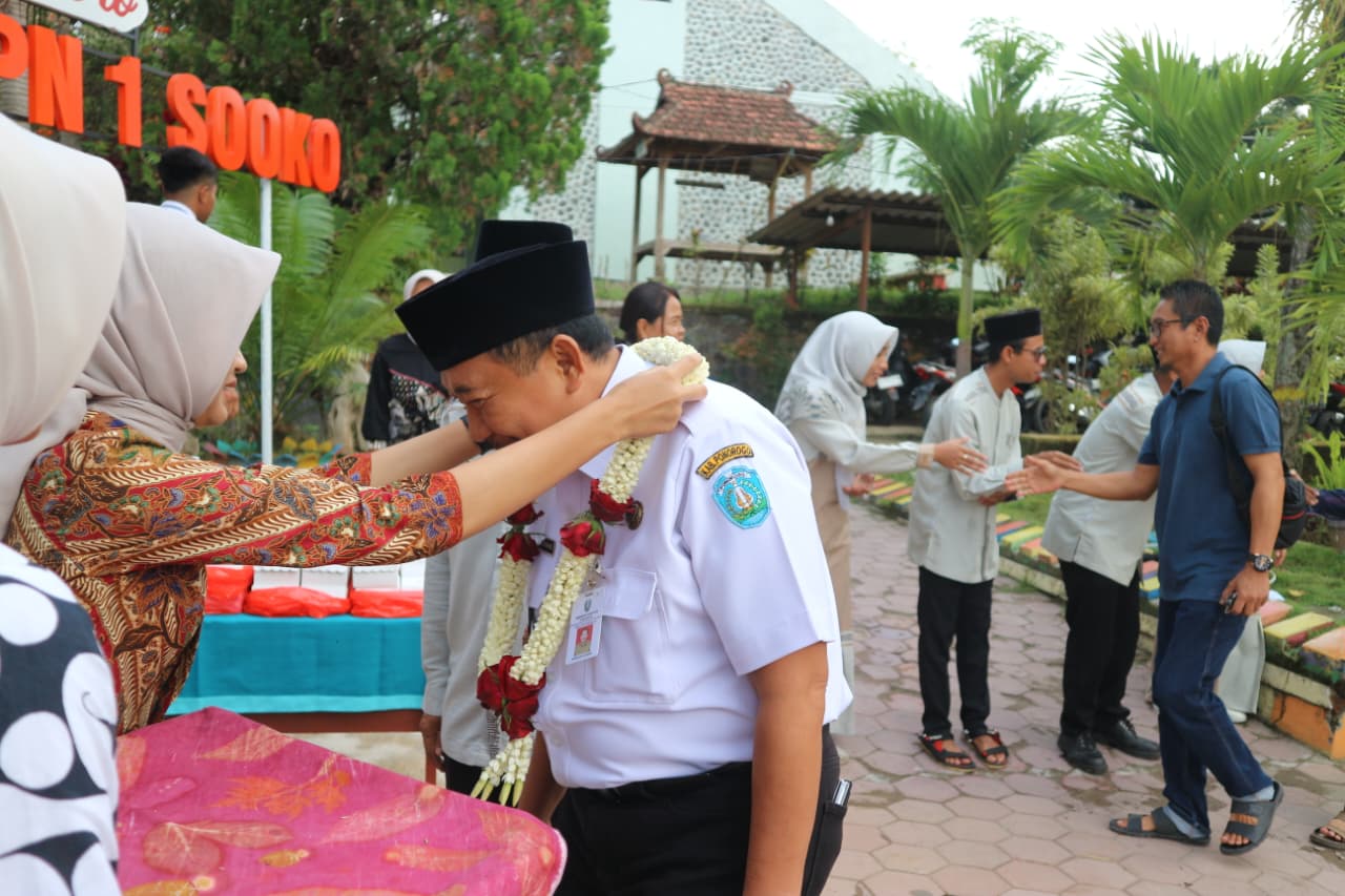 Kedatangan Kepala Dinas Pendidikan Kabupaten Ponorogo yang mewakili Bupati Ponorogo H. Sugiri Sancoko, M.M  disambut hangat oleh keluarga besar SMPN 1 Sooko. Prosesi penyambutan diawali dengan pengalungan melati kepada Kepala Dinas Pendidikan sebagai bentuk penghormatan, diiringi oleh alunan musik tradisional dan penampilan kesenian Reyog Ponorogo yang dibawakan oleh siswa-siswi SMPN 1 Sooko.